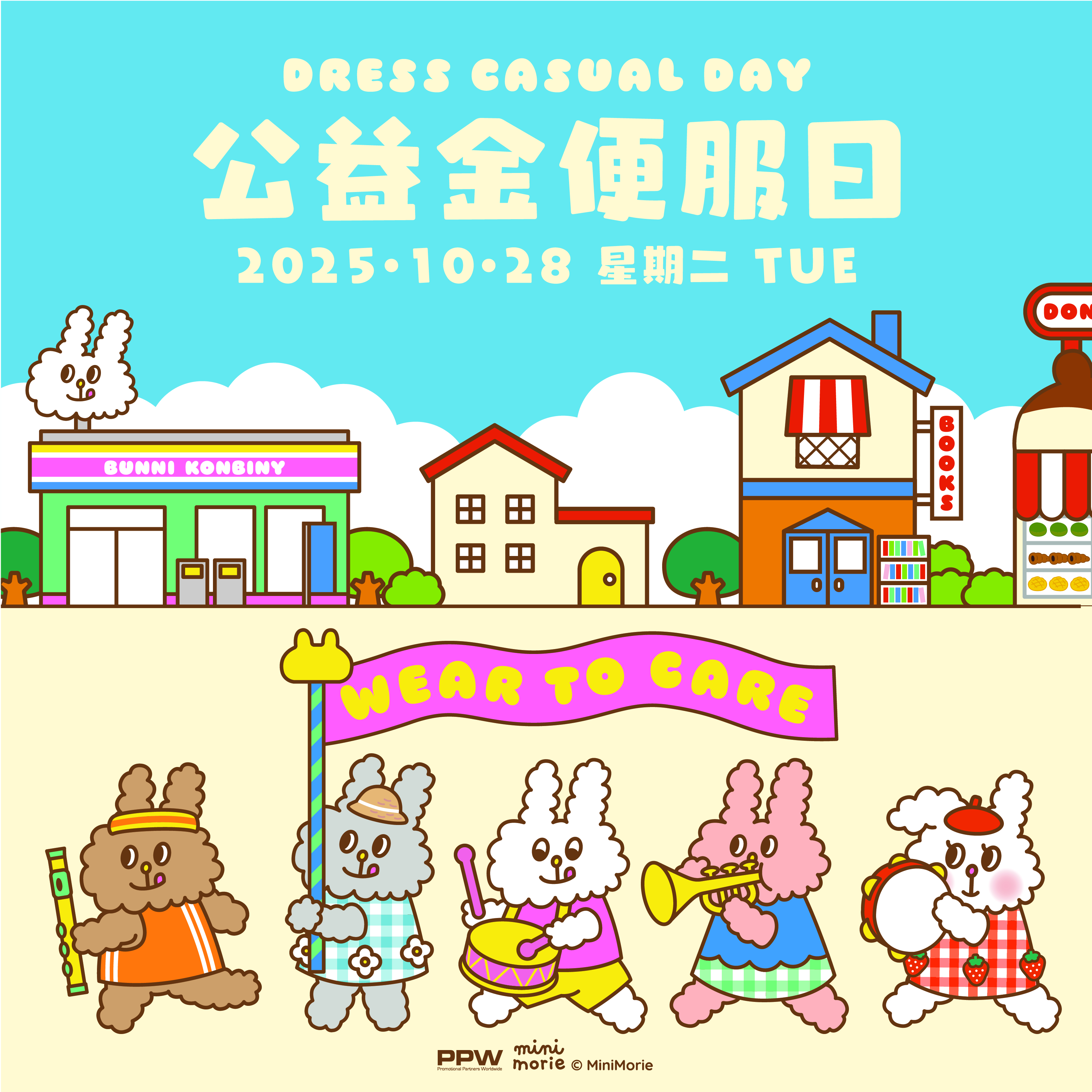 歌手洪嘉豪(Kaho)及謝曉盈(Kiri T)參與宣傳片拍攝,呼籲大眾支持便服日,一起行善為公益!此外,今年便服日與人氣IP Bunni Konbiny兔子便利商店攜手合作,為活動增添更多趣味及活力。